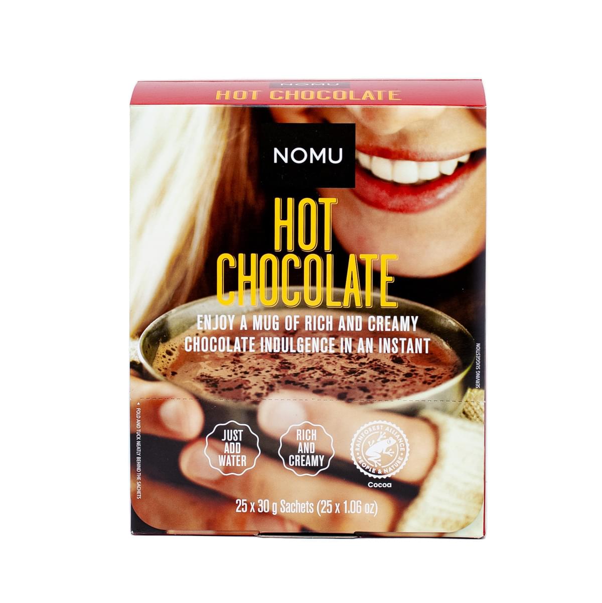 NOMU Just Add Water Hot Chocolate is an ideal and ultra-delicious hot chocolate treat for every office canteen, kitchen or cafeteria, school tuck shop, lunchbox or fireside camping opportunity.